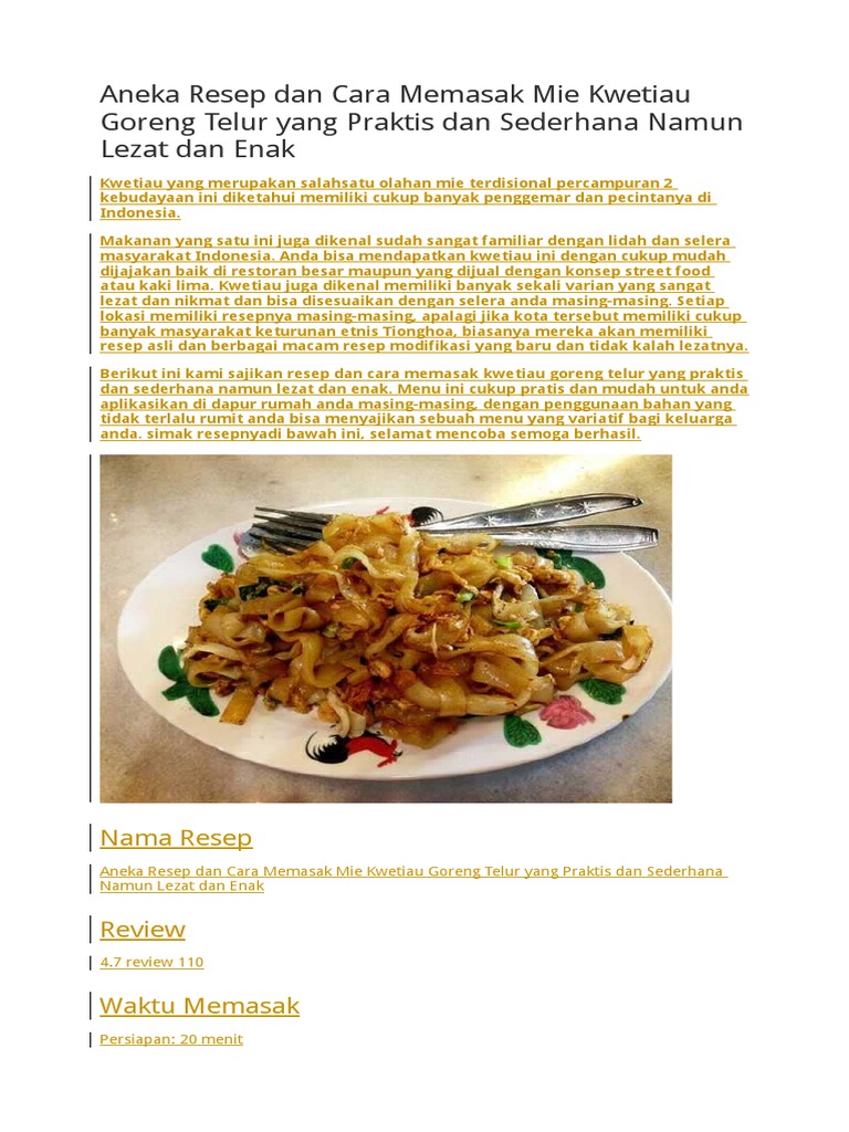 Aneka Resep Dan Cara Memasak Mie Kwetiau Goreng Telur Yang